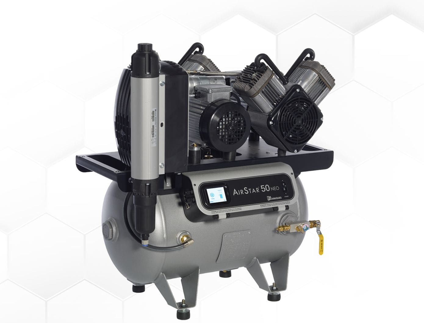 The AirStar NEO Dental Air Compressor series combines Air Techniques’ exclusive Membrane Dryer Technology and new integrated diagnostic monitoring functions for a state-of-the-art dental air compressor. These 100% oil-less compressors are virtually maintenance-free and sized for every practice. Each AirStar NEO features a full-color, digital touchscreen display and delivers unprecedented diagnostic controls. AirStar NEO will keep you informed of preventative maintenance with smart alarms. Upgrade your utility room with the most advanced AirStar compressor yet! Boasting a full color touchscreen for easy navigation and control as well as compatibility with Vision Monitor cloud-based IoT platform, feel confident your equipment will operate efficiently and alert you if there is a problem. Also equipped with a Virus-Bacteria Filter, which is used in conjunction with the Membrane Drying unit and has been independently tested by the SGS Frisenius Institute, showing retention of greater than 99.99995% for all particles regardless of size.